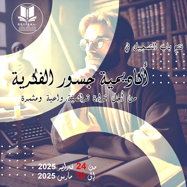 تعلن جسور القراءة بمدينة الدار البيضاء عن انطلاق التسجيل في أكاديمية جسور الفكرية، تسعى الأكاديمية الفكرية إلى خلق فضاء معرفي يعزز التفكير النقدي والقراءة الواعية، من خلال دراسة المشاريع الفكرية الكبرى، وتطوير منهجية قراءة تراكمية تستند إلى النقاش المنظم، التحليل العميق، والإنتاج المعرفي، وذلك تجت شعار"من أجل قراءة تراكميّة، واعية ومثمرة".
